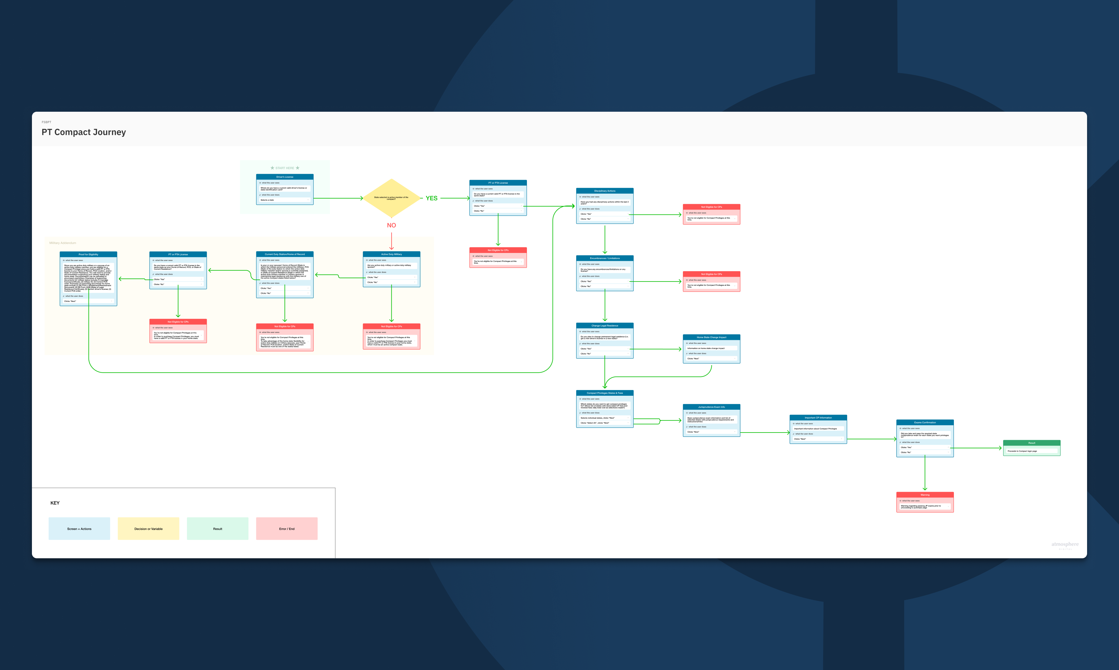 - Shorthand Flows: Outlined core task flows for seeking privileges, checking eligibility, and comparing options between compact privileges and traditional licensure.